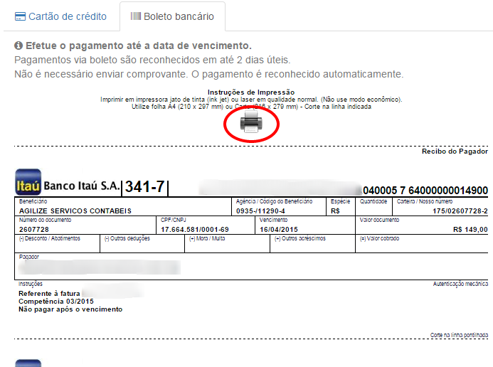 Você também tem a opção de pagar via boleto bancário. A desvantagem do pagamento via boleto é que o pagamento precisa ser manual, e demora até 2 dias úteis para ter o pagamento reconhecido pelo sistema.