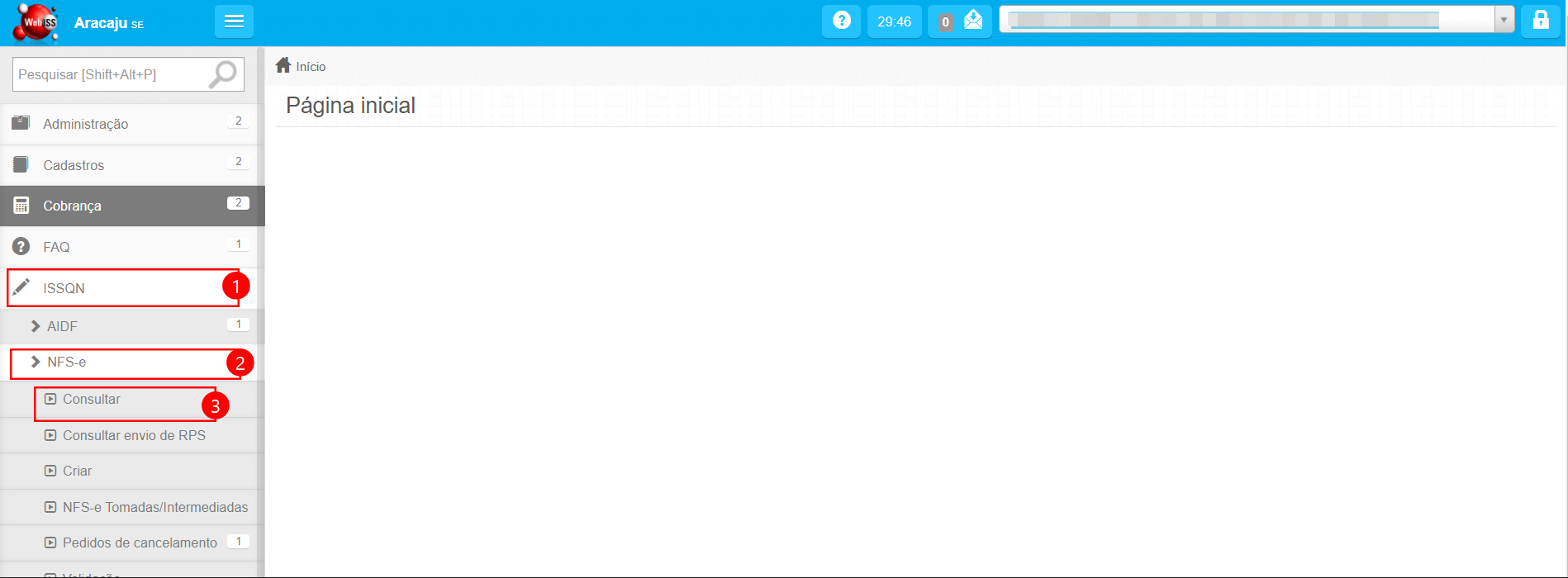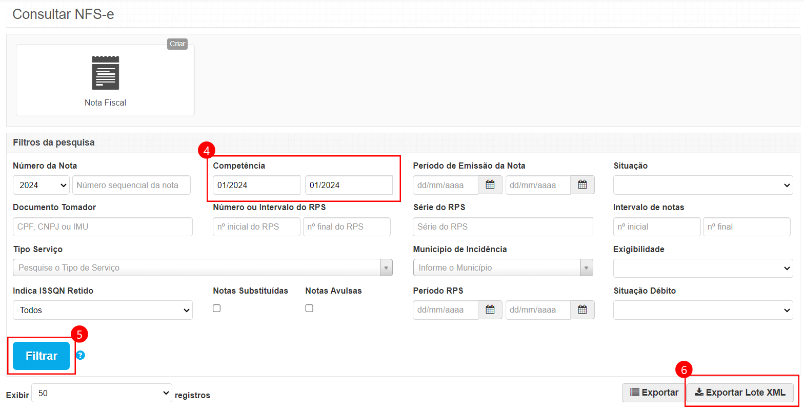 Passo 1: Após efetuar o login, clique em ISSQN > NFS-e > Consultar. Informe a competência que deseja exportar o XML e clique em Filtrar.