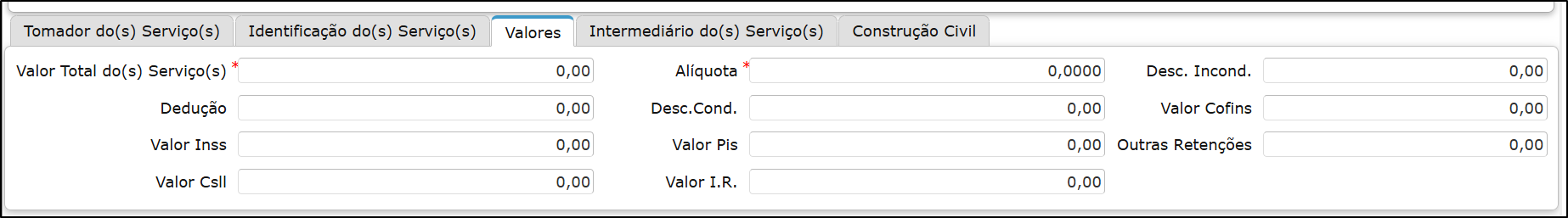 Passo 5: Em "Valores" informe o valor total da prestação do serviço, e a alíquota de ISS. O campo relacionado aos impostos federais deverá ser preenchido com as devidas retenções. Caso não haja retenção de impostos, deixar o campo em branco.