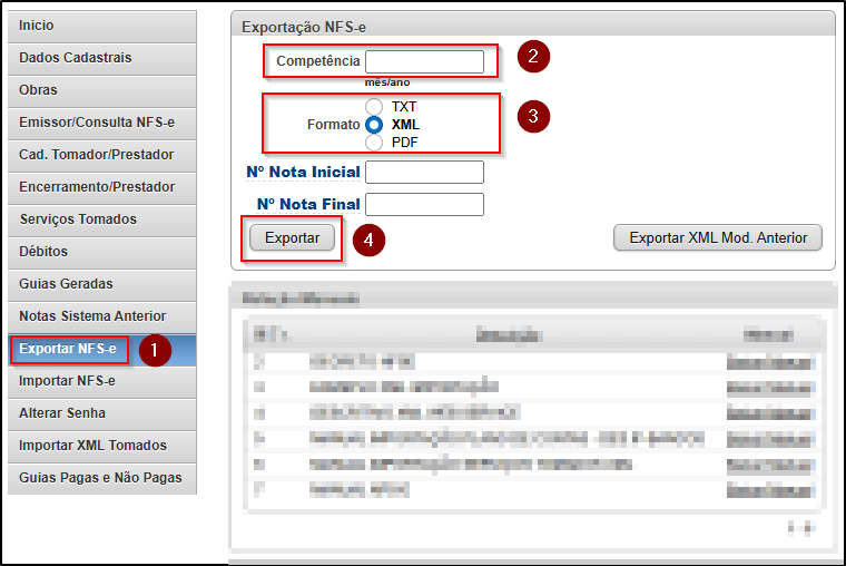 Passo 1: Após efetuar o login, selecione a opção "Exportar NFSe > Informe a competência (mês) desejada > Formato XML e clique em "Exportar".