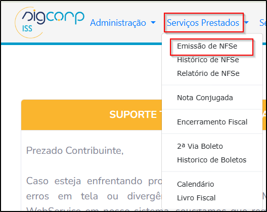 Passo 2: Feito o login, no menu superior, acesse a aba Serviços Prestados e selecione a opção Emissão de NFS-e.