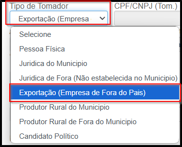 Passo 3: Na tela de emissão, selecione o Tipo do Tomador exportação (empresa fora do País) e na tela seguinte pesquise o cadastro dele no portal.