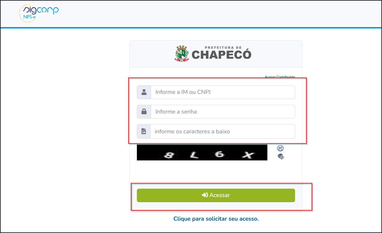 Inicialmente, deve-se efetuar o login no portal da Prefeitura de Chapecó.