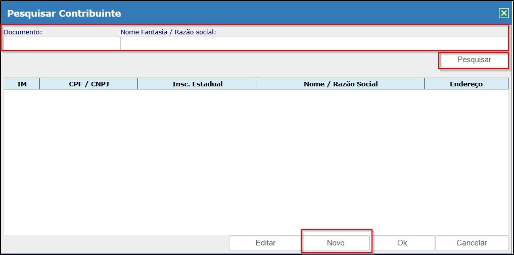 Se o tomador do serviço não estiver cadastrado, na tela de pesquisar deve clicar em Novo, informar os dados solicitados e salvar para concluir o cadastro. Uma vez cadastrados, os dados ficarão salvos e disponíveis para futuras emissões.