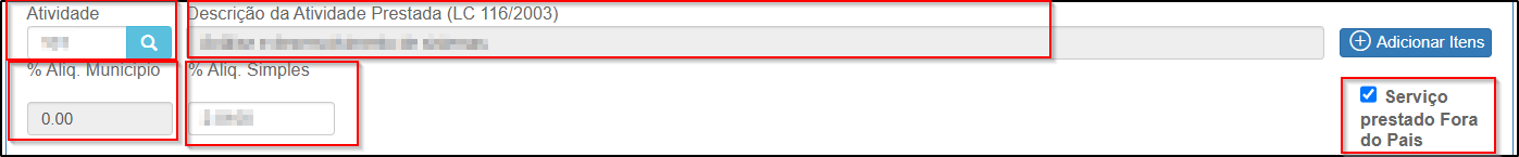 Descrição da Atividade: deve ser obrigatoriamente preenchida. Apesar de não haver um conteúdo específico exigido, é recomendável utilizá-lo para descrever o serviço prestado, indicar descontos incondicionais, formas de pagamento e outras informações relevantes.