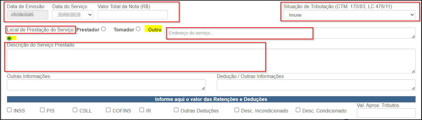 Passo 5: Informe a data de emissão da nota e a data da prestação do serviço.