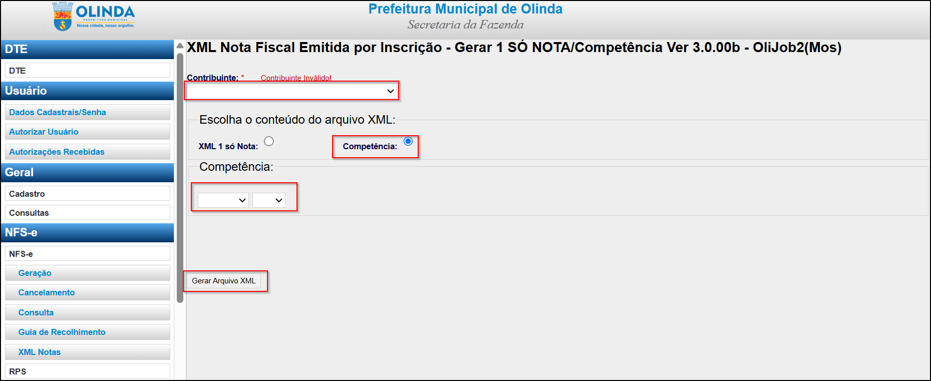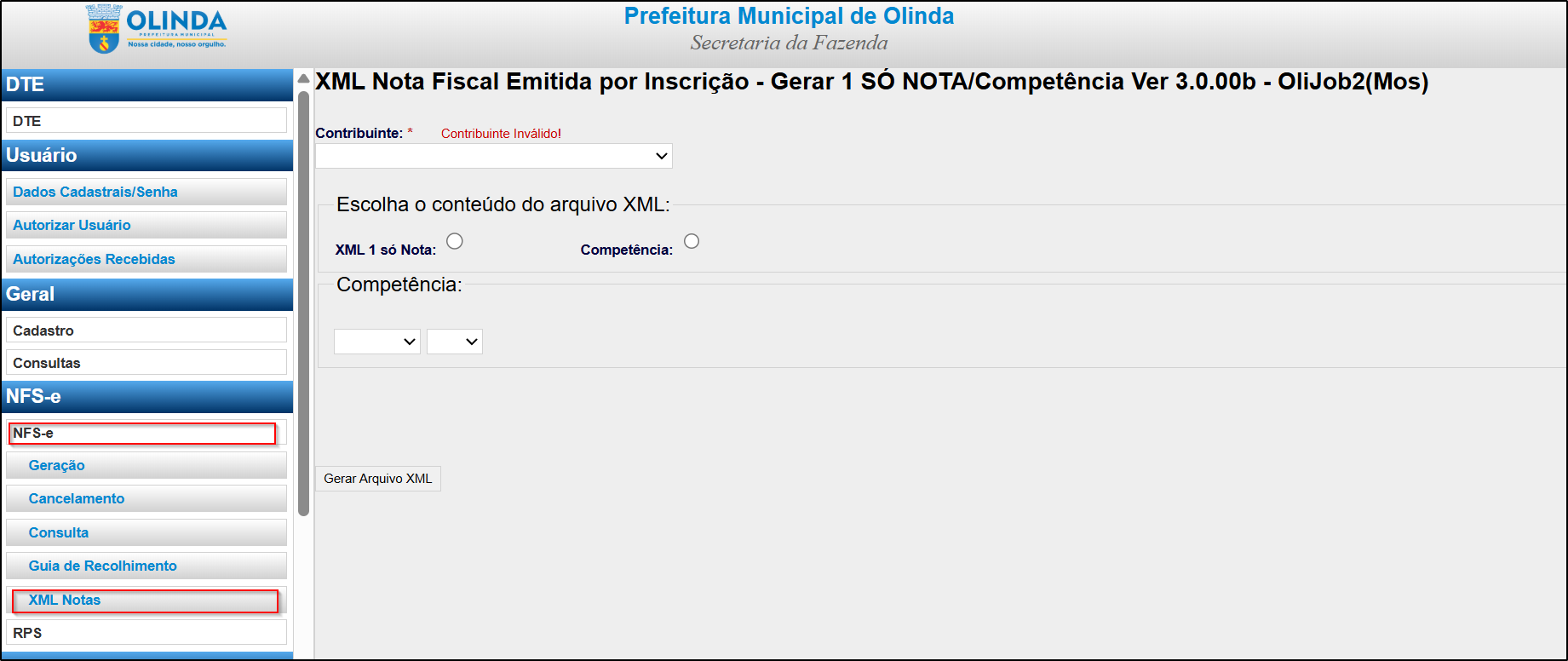 Em “Competência”, escolha o período desejado, informando o mês e o ano das notas fiscais que deseja exportar em formato XML.