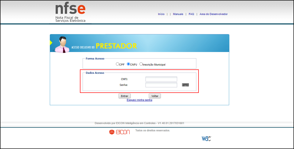 No lado superior da tela, selecione a opção “Acesso Exclusivo – Prestador”, em seguida preencha as informações de login com suas credenciais de acesso e selecione a opção “Entrar”.