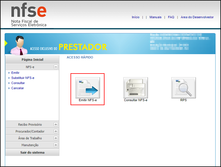 Após efetuar o login, seleciona-se a opção “Emitir NFS-e”.