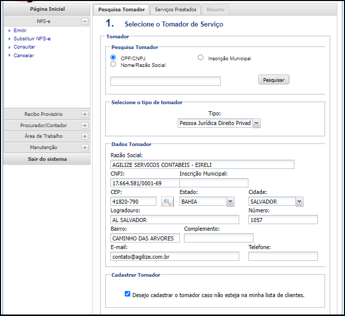 Passo 1: Inicialmente, deve-se preencher os dados do tomador do serviço. É possível salvar as informações para futuras emissões. Após isso, clicar em “Próximo Passo”.