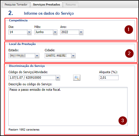 Passo 2: Informar os dados do serviço que está sendo prestado.