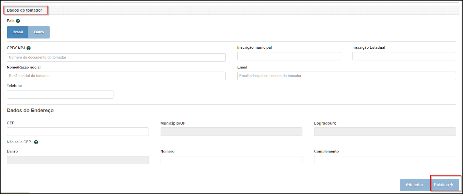 Passo 2: Informe os dados completos do tomador do serviço (seu cliente). A prefeitura poderá buscar informações do CNPJ informado e preencher alguns campos automaticamente. É necessário realizar a conferência e, se necessário, alteração. Em seguida, clique no botão próximo.