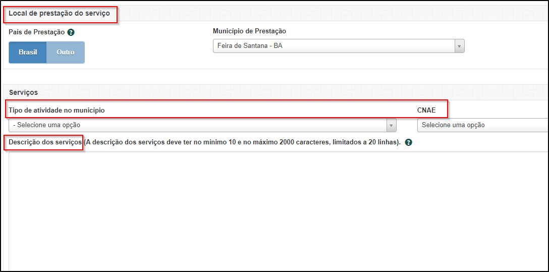 Passo 4: Confirme o local da prestação de serviço, em seguida selecione a atividade e CNAE (código correspondente ao serviço realizado, devendo ser selecionado a partir da lista disposta).