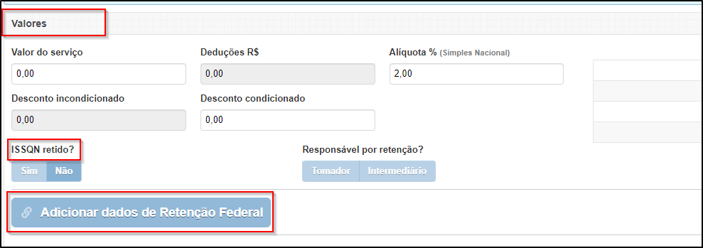 O campo "Adicionar dados de Retenção Federal" deverá ser preenchido com as devidas retenções. Caso não haja retenção de impostos, deixar o campo em branco.