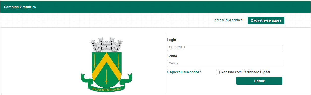 Inicialmente, deve-se efetuar o login com as suas credenciais no portal da prefeitura de Campina Grande e selecionar a opção “Entrar”. Também é possível acessar com certificado digital.