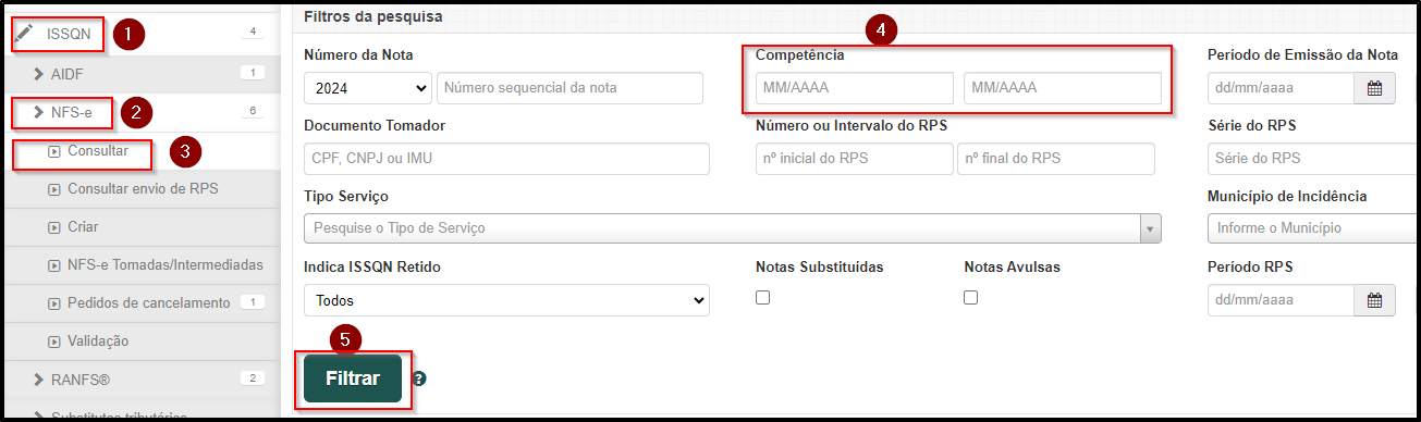 Passo 1: Após efetuar o login, clique em ISSQN > NFS-e > Consultar. Informe a competência que deseja exportar o XML e clique em Filtrar.