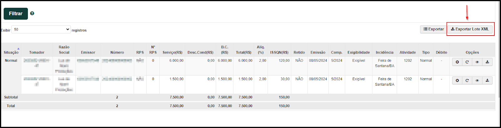 Passo 2: Ao clicar em filtrar, irá aparecer todas as notas emitidas do período, selecione a opção "Exportar Lote XML", como na imagem a seguir.