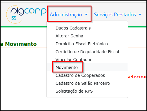 Passo 2: Feito o login, no menu superior, acesse a aba Administração e selecione a opção Movimento.