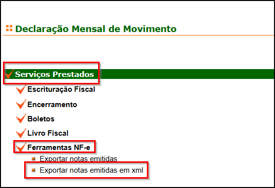 Passo 4: Na tela seguinte, na opção Serviços prestados, clique em Ferramentas NF-e e depois em Exportar notas emitidas em XML.