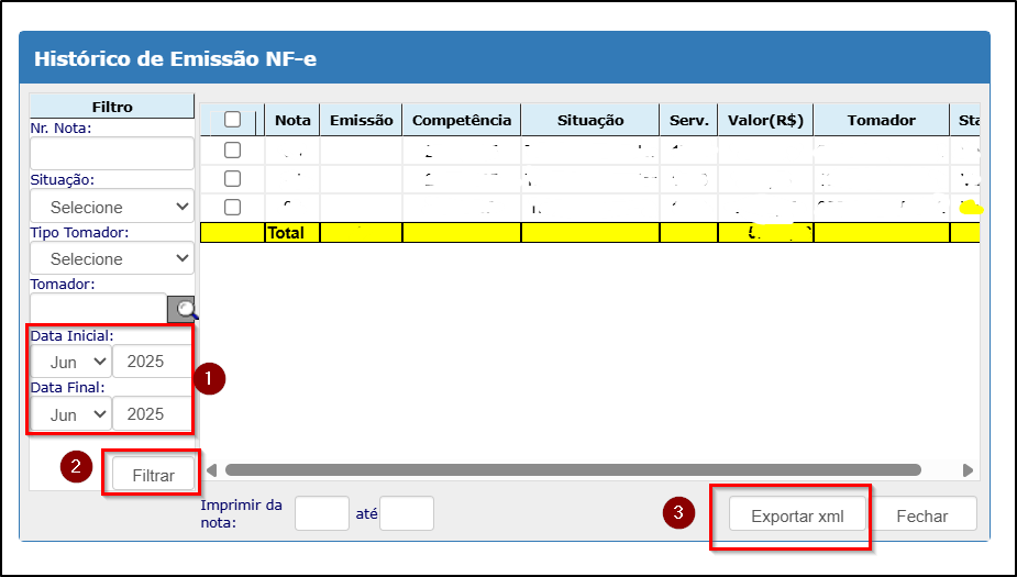 Passo 5: Na tela seguinte, informe a competência das notas que deseja importar nos campos "Data Inicial e Data Final", clique em "Filtrar", selecione as notas fiscais emitidas e depois clique em "Exportar XML".