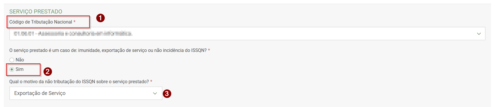 A opção escolhida para "O serviço prestado é um caso de: exportação, imunidade ou não incidência do ISSQN?" será "Sim".