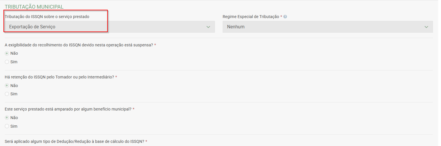 Passo 13: O campo “Tributação Municipal” será preenchido automaticamente com as informações que foram inseridas até agora e não deve ser modificado, ficará como "exportação de serviço".