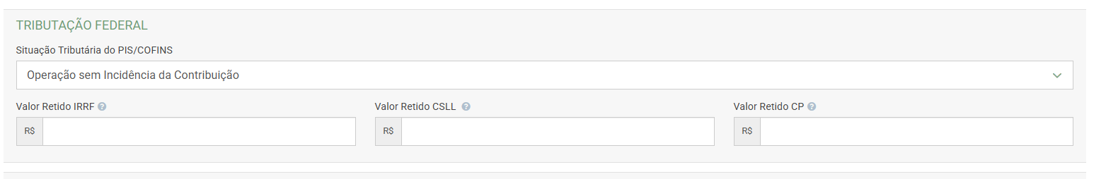 Passo 14: No campo de tributação federal, selecione a opção “Operação sem incidência da contribuição” e deixe os campos de "valor retido de IRRF, CSLL, CP" em branco.