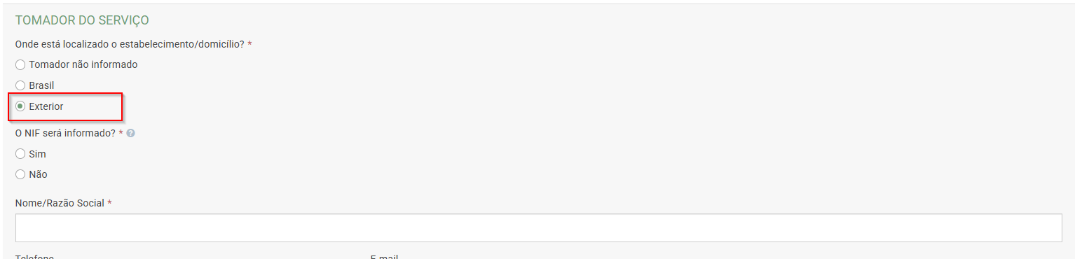 Passo 5: Preencha as informações do tomador do serviço, que neste caso é uma empresa ou pessoa localizada no exterior, preencha manualmente os campos obrigatórios.