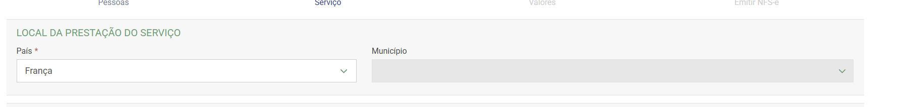 Passo 7: Na seção de "serviço", inicie preenchendo o campo local da Prestação do Serviço: selecione o país onde o serviço foi executado.