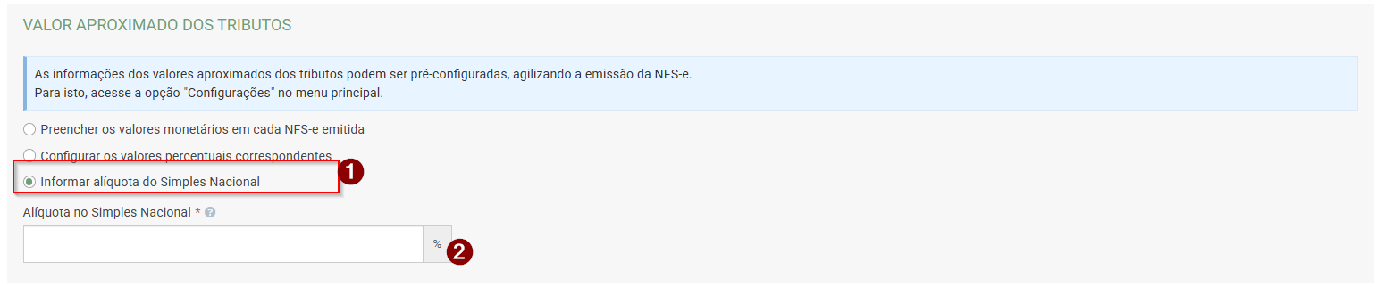 Passo 15: No campo “Valor Aproximado dos Tributos” selecione a opção “Informar alíquota do Simples Nacional” e adicione a alíquota correspondente ao mês.