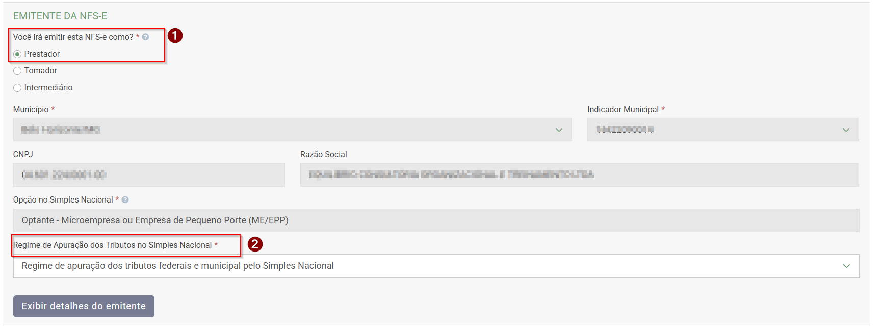 Passo 4: No campo "EMITENTE DA NFS-E", selecione "Prestador". Isso preencherá automaticamente as informações da sua empresa. Além disso, escolha a opção "Regime de apuração dos tributos federais e municipais pelo Simples Nacional" na aba "Regime de Apuração dos Tributos no Simples Nacional".