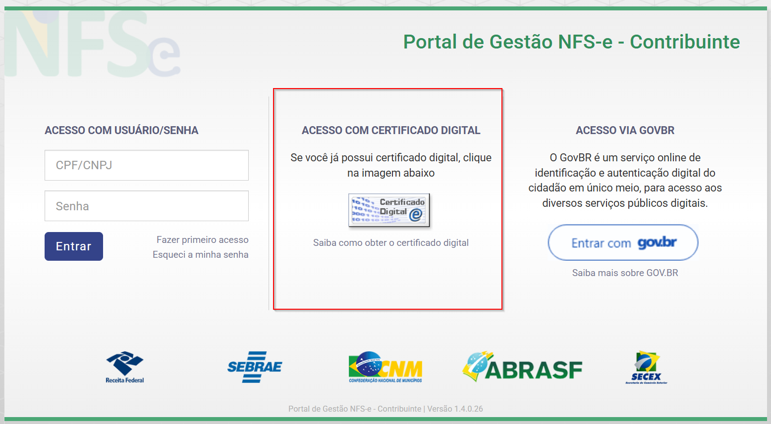 Passo 1: Acesse o portal da prefeitura e realize o login exclusivamente por certificado digital da empresa.