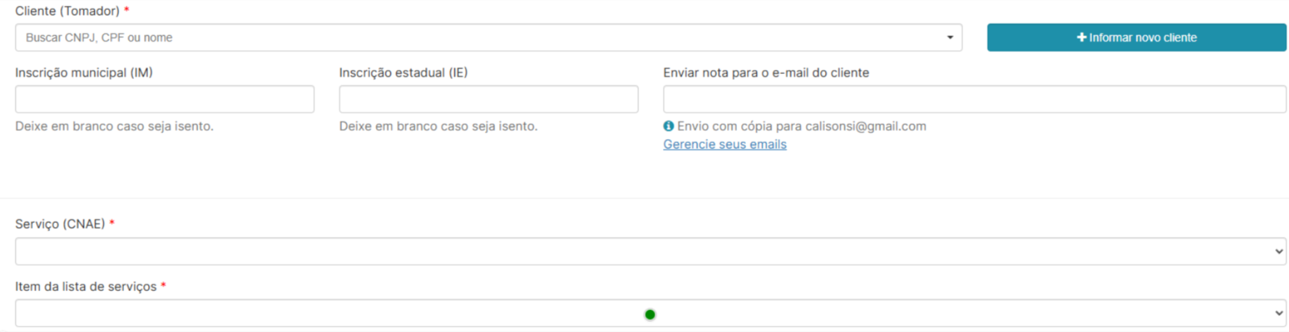 Serviço (CNAE): Aqui você escolhe, entre os CNAEs cadastrados na sua empresa, aquele que representa a atividade realizada nesse serviço específico.