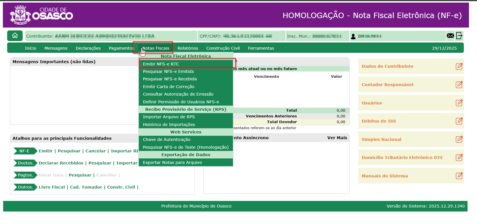 Passo 2: Após efetuar o login, selecione a opção "Nota Fiscal e “Emitir NFS-e”.