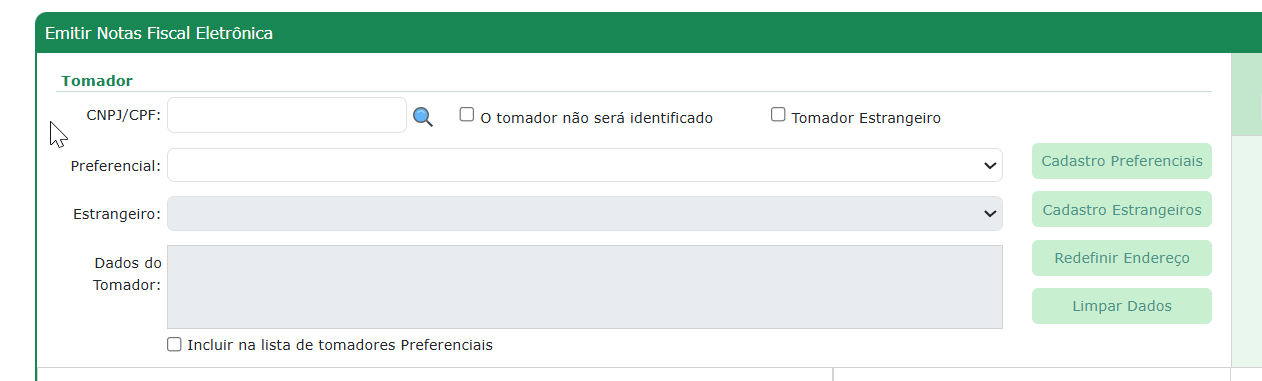 Passo 3: Inicialmente, deve-se preencher os dados do tomador. Uma vez cadastrados, ficarão salvos e disponíveis na aba “Tomador Preferencial”.
