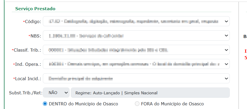 Classif. Trib.: Determina qual tributação se aplica ao serviço. Em regra geral, será "0001 - situações tributadas integralmente pelo IBS e CBS", exceto quando a legislação indicar um tratamento diferente.