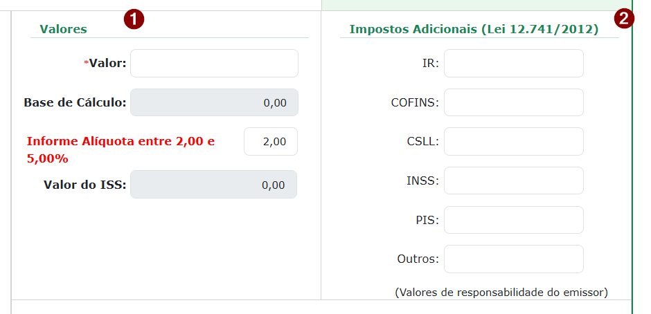 Logo em seguida, o campo “Impostos Adicionais” deverá ser preenchido com as devidas retenções. Caso não haja retenção de impostos, deixar o campo em branco.