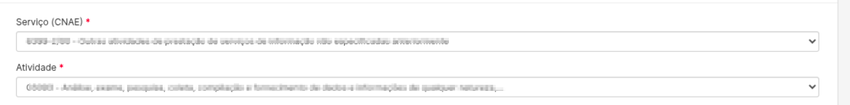 Serviço (CNAE): Aqui você escolhe, entre os CNAEs cadastrados na sua empresa, aquele que representa a atividade realizada nesse serviço específico.