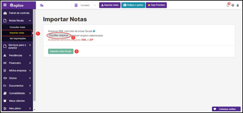 Passo 4: O arquivo baixado vai conter as notas fiscais do período em formato XML. Após o download, basta ir em seu painel de controle no campo Notas Fiscais > Importar Notas > Escolher Arquivos > Importar notas fiscais.