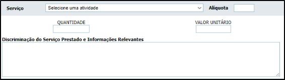 Passo 4: Neste campo, será necessário preencher os dados do serviço. Primeiro, deve-se selecionar a atividade a partir da lista disposta pela prefeitura. Em seguida, será necessário selecionar a quantidade e o valor do serviço prestado. O próximo passo a preencher é “Discriminação do Serviço da Nota Fiscal”. Embora não haja nenhuma informação obrigatória que deva constar neste campo, o seu preenchimento é obrigatório.
