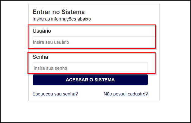 Passo 1: No centro da tela, preencha os dados com suas credenciais de acesso e selecione em “Acessar o Sistema”.