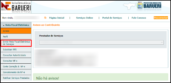 Passo 2: Após efetuar o login, selecionar a opção “Emitir Nota Fiscal Eletrônica de Serviços" no lado esquerdo da tela.